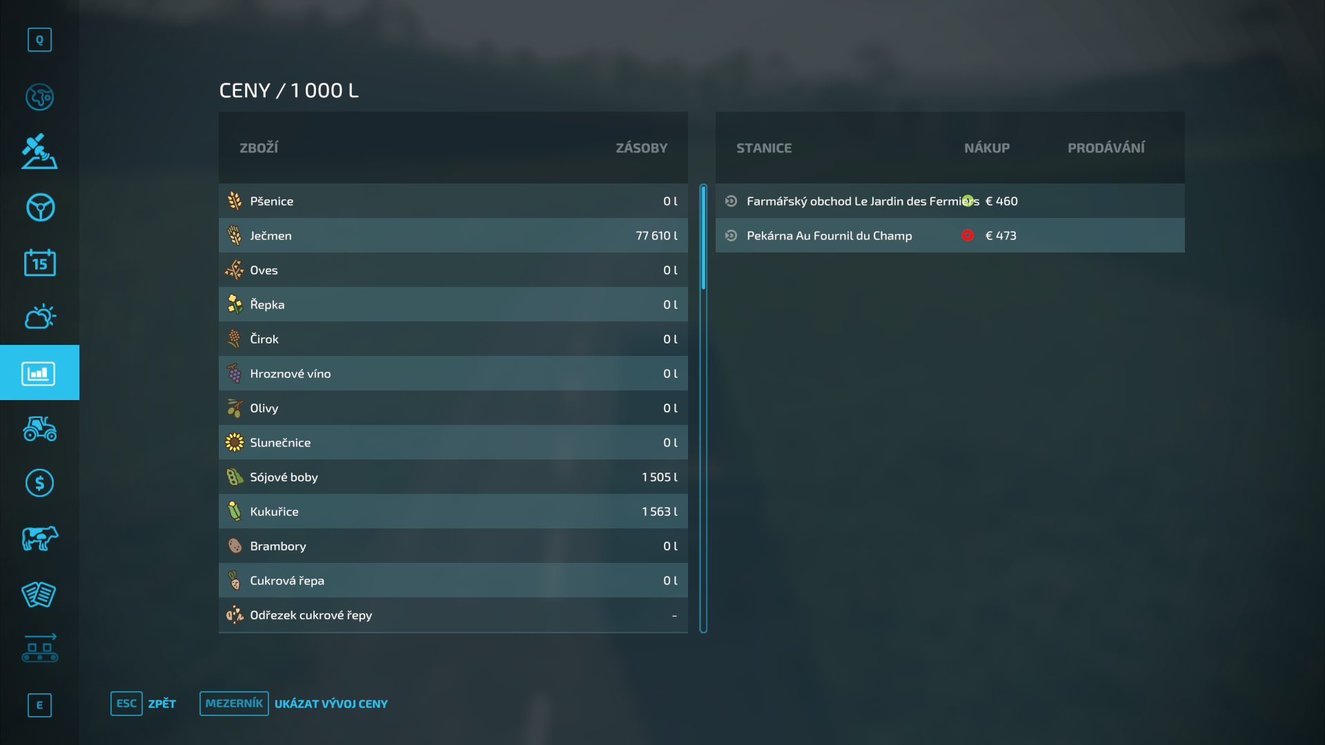 Nastala ale taká vec, že jedna misia zostala nesplnená, že som nedodal všetok jačmeň. Tak ok, tak som ju zrušil. Potom som si všimol, že ten jačmeň, ktorý som navozil, ale mi ho nezobralo v tom predajnom bode mi svieti ako keby v sýpke (keď som si otvoril menu s cenami produktov, pri niektorých vám svieti zásoba), ale ked prídem na farmi pod silo, tam mám nulu...