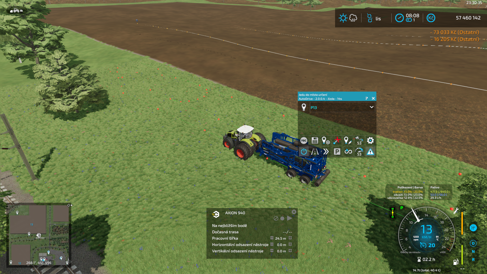 11. Odvoz od kombajnů je obdobný jako v FS19, pro kombajn se vytvoří kurz CP, pro odvozce zase kurz AD, důležitý je stejné číslo pole. Kombajn jde spustit buď přímo v menu CP nebo si otevřít mini HUD přímo ve hře - defaultně pravé myšítko.