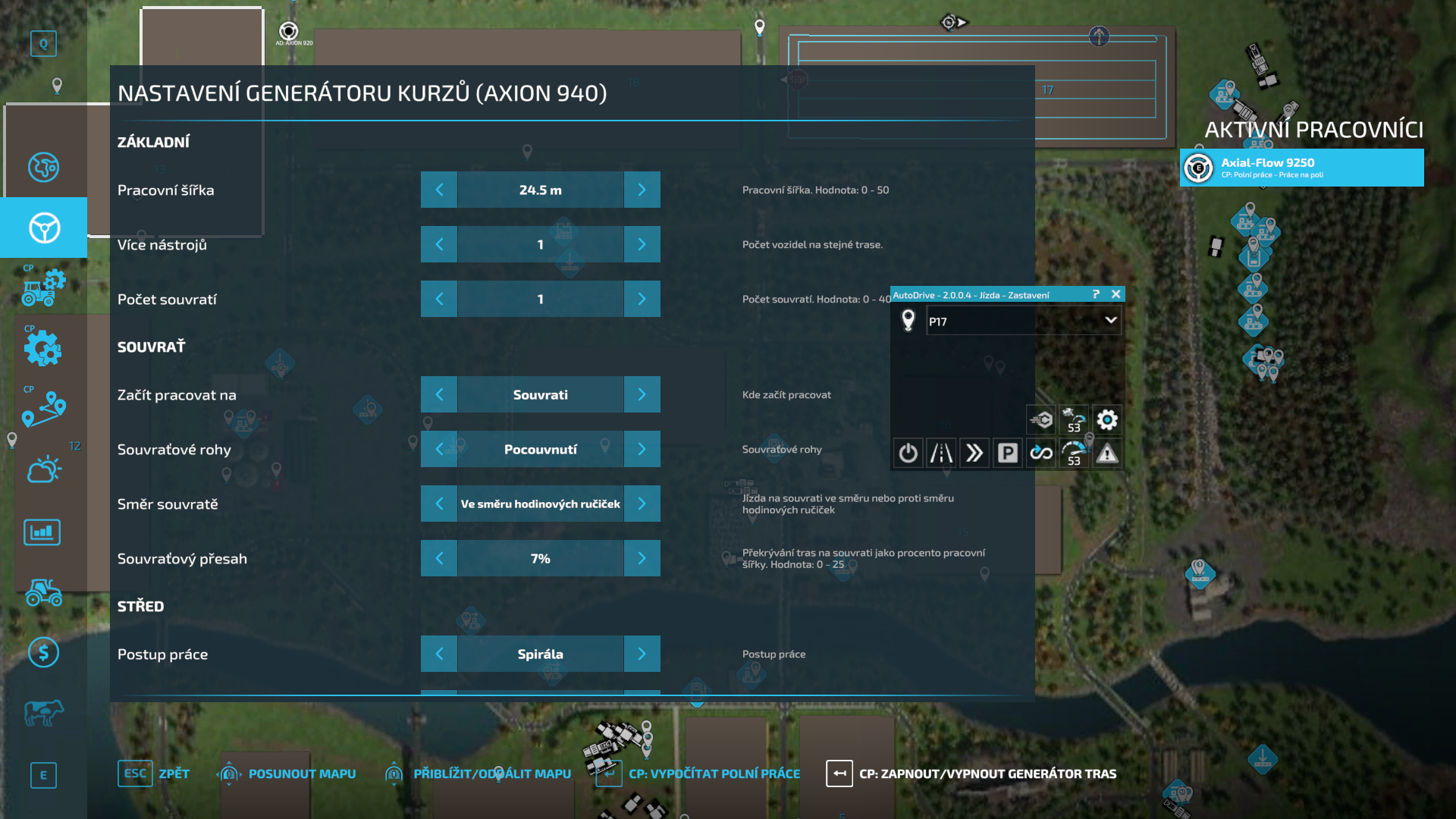 8. Po nastavení kliknout dole na CP: Vypočítat polní práce, tím se vygeneruje trasa, kliknutím na CP: Zapnout/Vypnout generátor kurzů ho vypnout